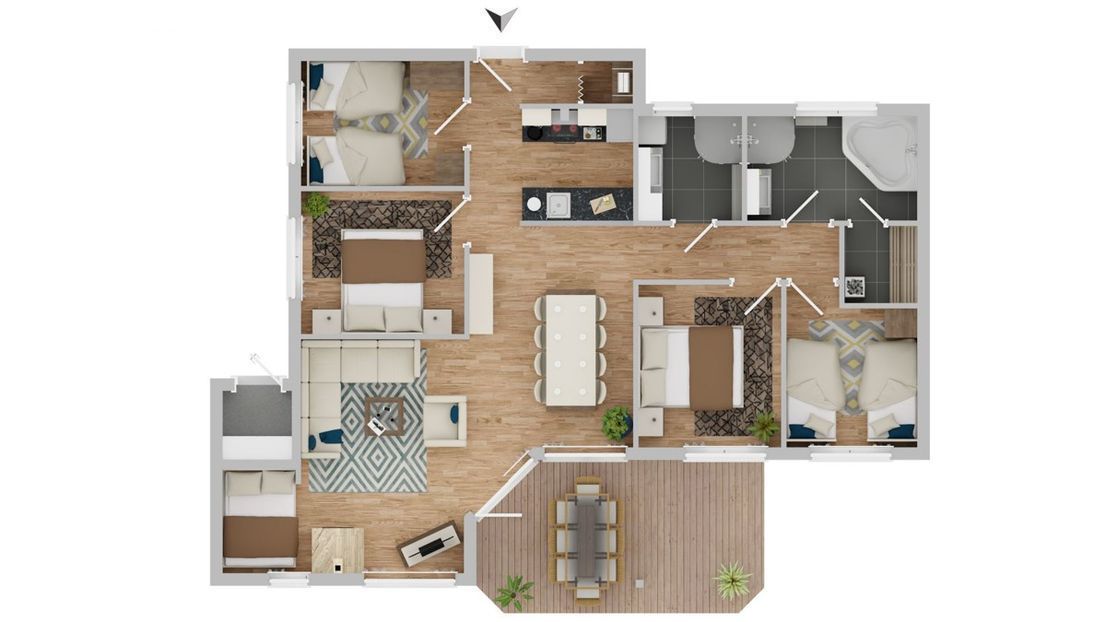 Der Haustyp „Poel“ ist mit 90 m² der Größte im Resort – ideal für bis zu 10 Personen. Fünf Zimmer, zwei Bäder, Sauna, Whirlpool und ein gemütlicher Alkoven bieten viel Platz und Komfort.